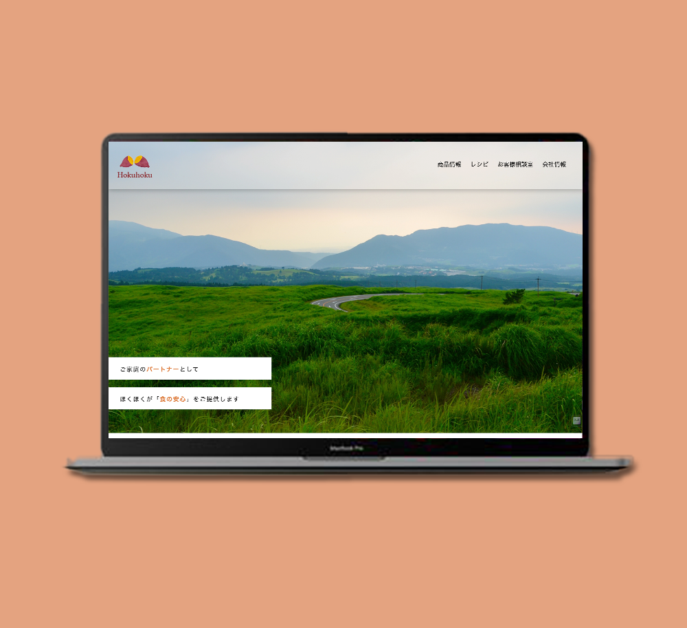 ファーストビューには、一目見て農業関連だとわかるよう仮想で設定した九州地方の風景を入れて、左下にメッセージを入れました。スクロールしていくと商品の一覧と、ニュースがスライドショーで出るようになっています。