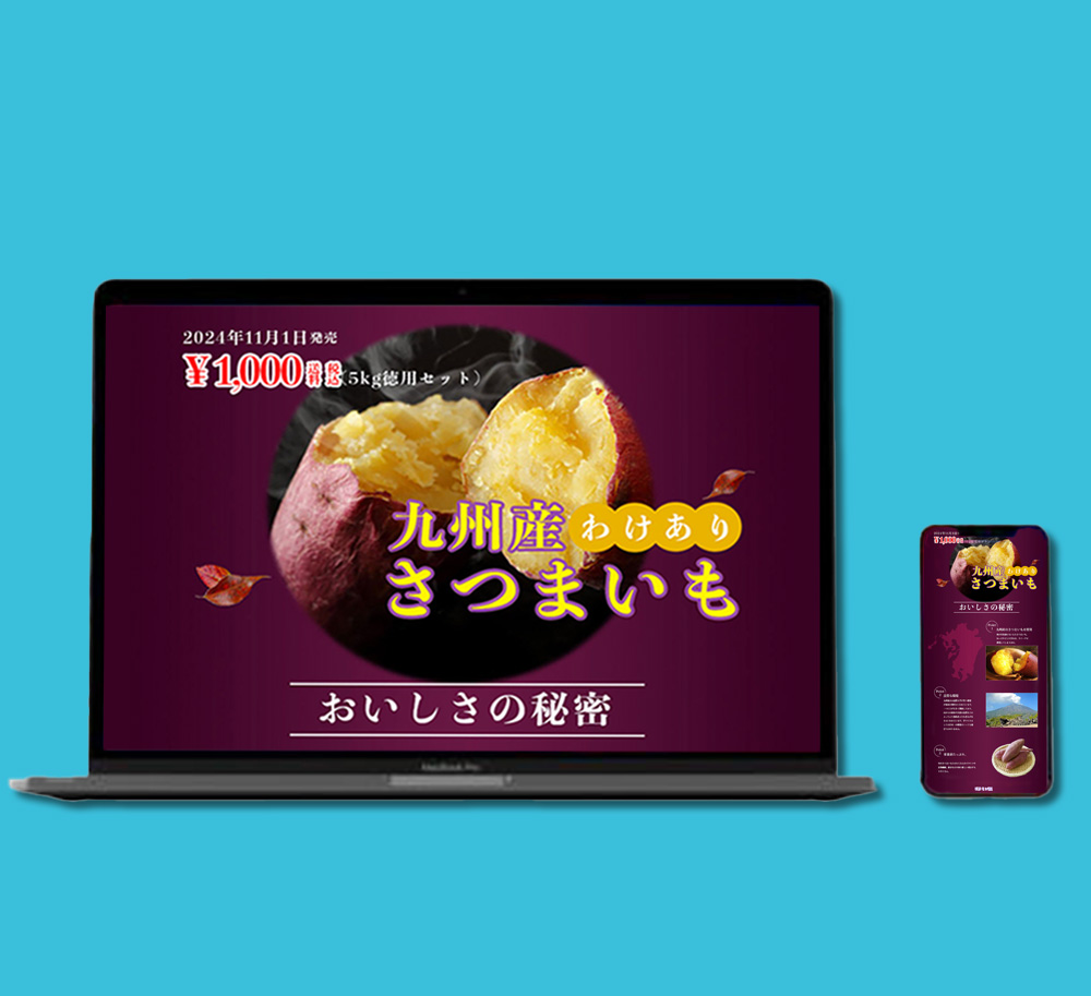農家から直接仕入れた九州産訳ありさつまいもを購入してもらうためのLP(ランディングページ)です。 "おやつやメインの食事にさつまいもを取り入れることで美容にも健康にもいい食生活を送ること"が今回のスローガンです。消費者の当商品を購入することで得られる効用は美容と健康だと考え、CTA(コールトゥーアクション)は"美容と健康のためにおやつをさつまいもに変えてみましょう。"と設定しました。